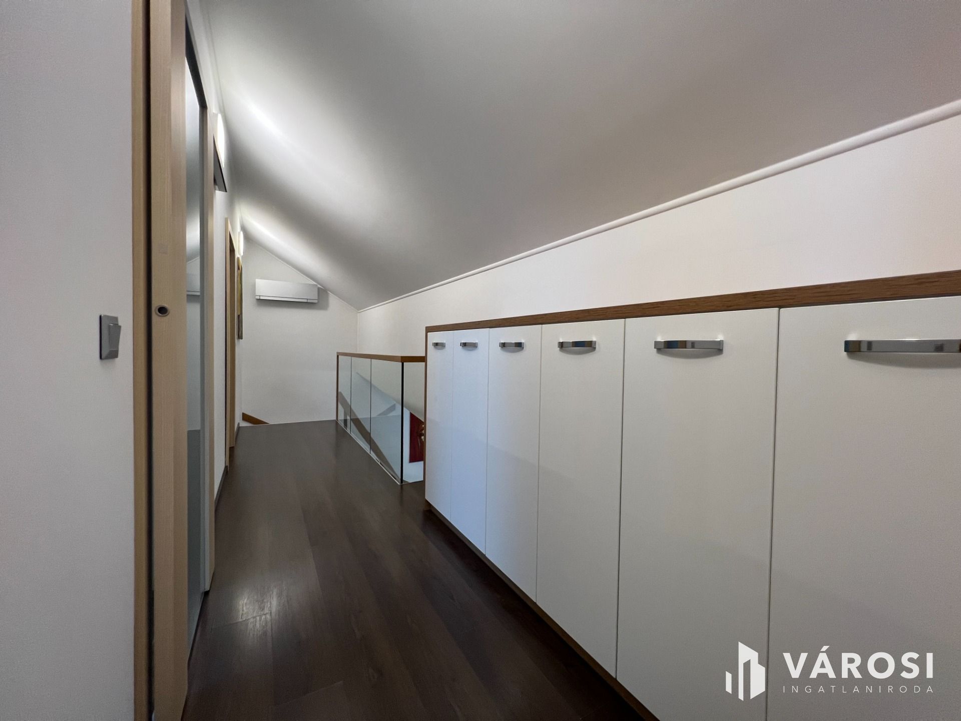 Minden helyiség bútorozott, nagyon szép anyagok, falburkolatok kerültek felhasználásra. A nappaliból az emeletre egy minimál tervezésű modern lépcsőn juthatunk, ahol üveg korlátok teszik még elegánsabbá, légiesebbé a teret.