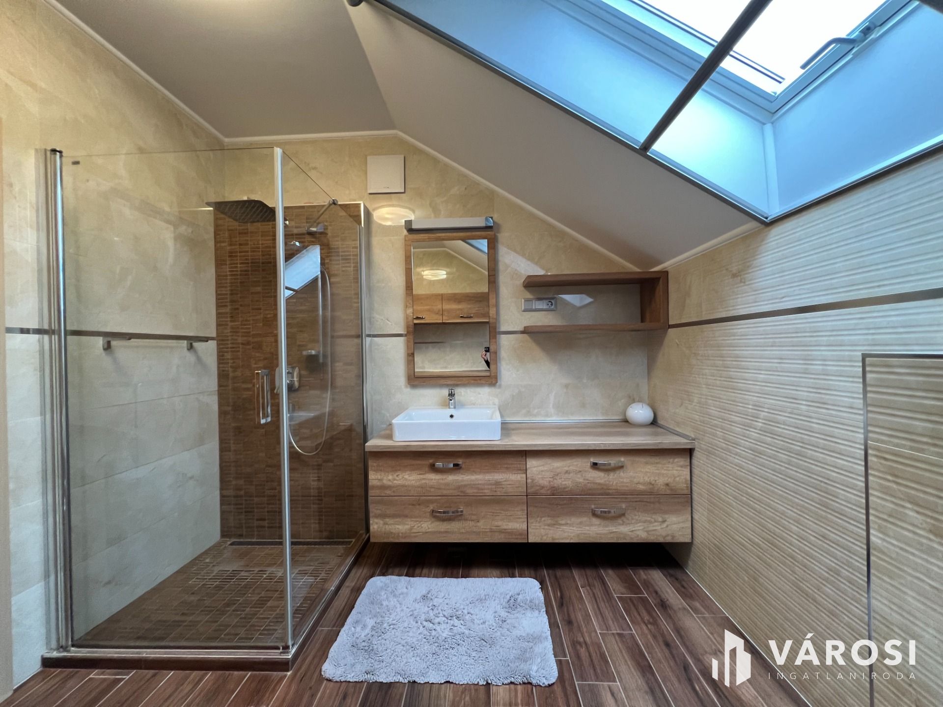 A földszinten található egy minden igényt kielégítő amerikai konyhás nappali, egy tágas kádas fürdőszoba wc-vel, gardrób, külön wc-bidé, közlekedő-mély pakolható gardrób szekrényekkel, továbbá egy világos modern hálószoba.