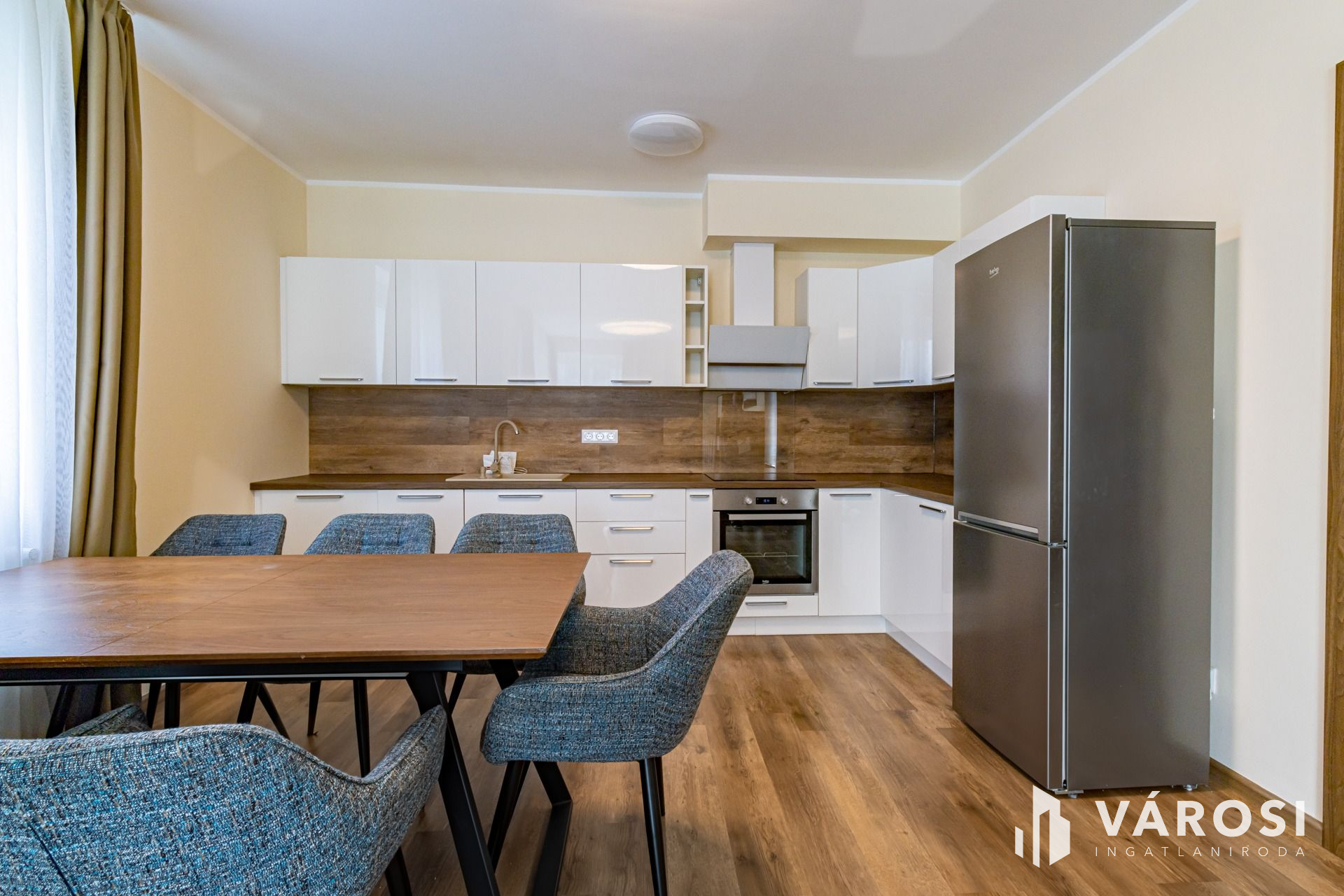 A lakás a képeken látható prémium bútorokkal és gépekkel van esztétikusan berendezve.