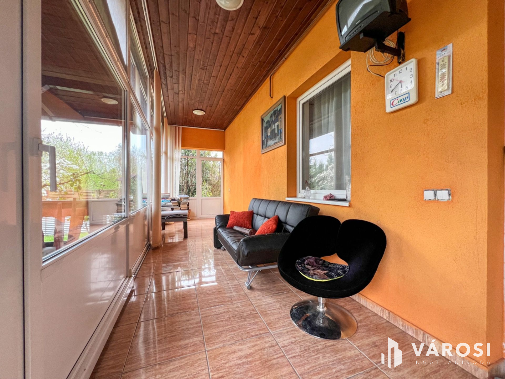 Helyiségei: 2 hálószoba, nappali, konyha+étkező, kamra, közlekedő, gardrób, mosóhelyiség, fürdőszoba, szauna, külön nyíló W.C., szélfogó, garázs, beépített terasz, nyitott terasz.
