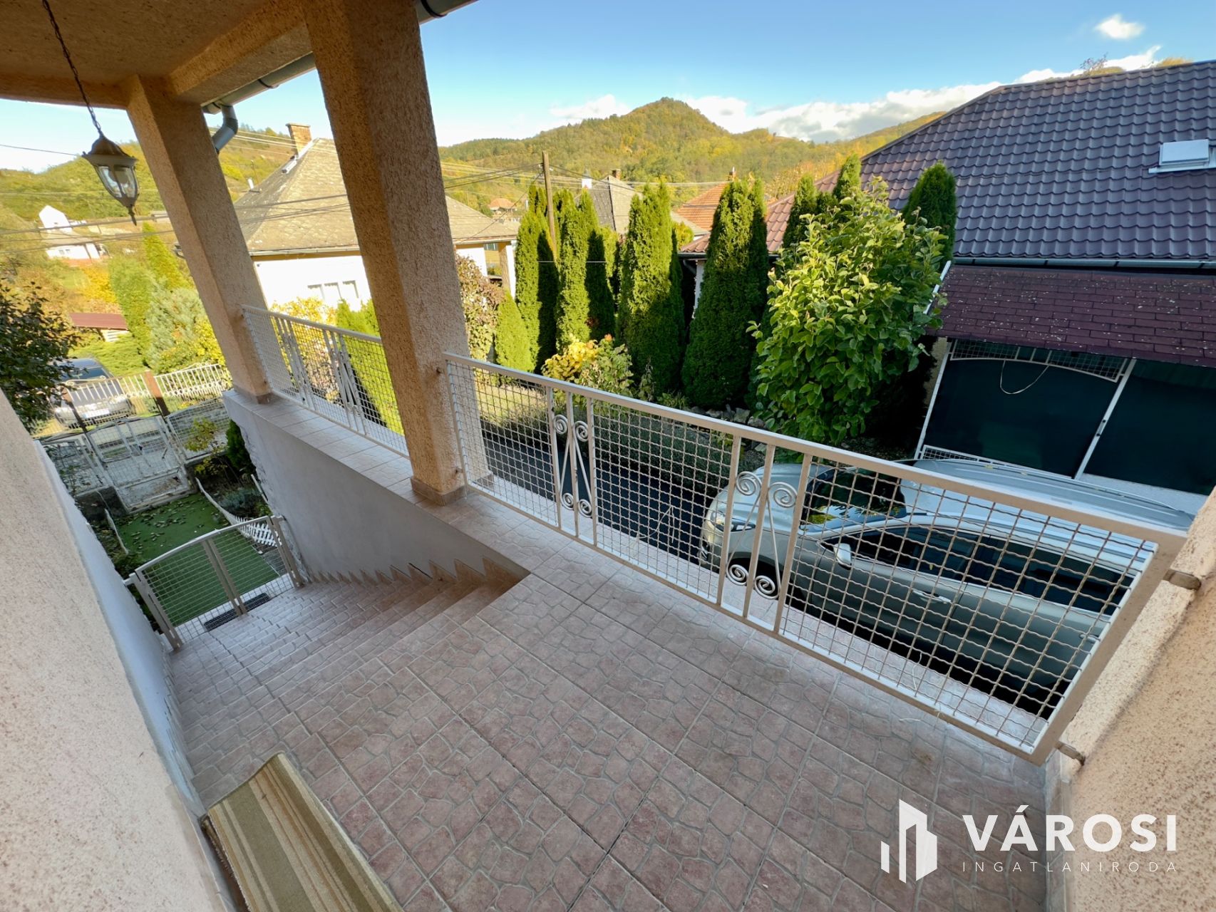 Helyiségei: az alsó szinten konyha, étkező, kamra, külön nyíló W.C., közlekedő, kazánház, garázs (elektromos kapuval), a felső szinten 4 szoba, közlekedő, 2 fürdőszoba.