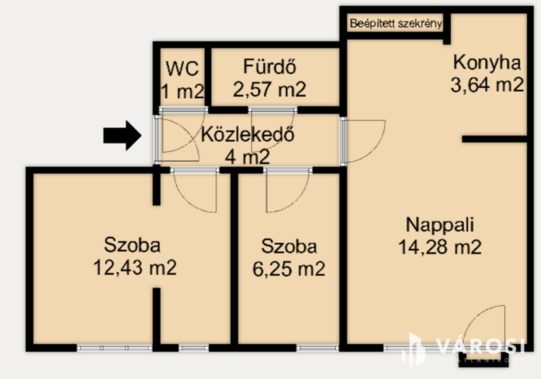 A jól átgondolt elrendezésnek köszönhetően a nappali és a konyha egy légtérben kapott helyet, míg a két külön nyíló hálószoba kényelmes életteret biztosít.
