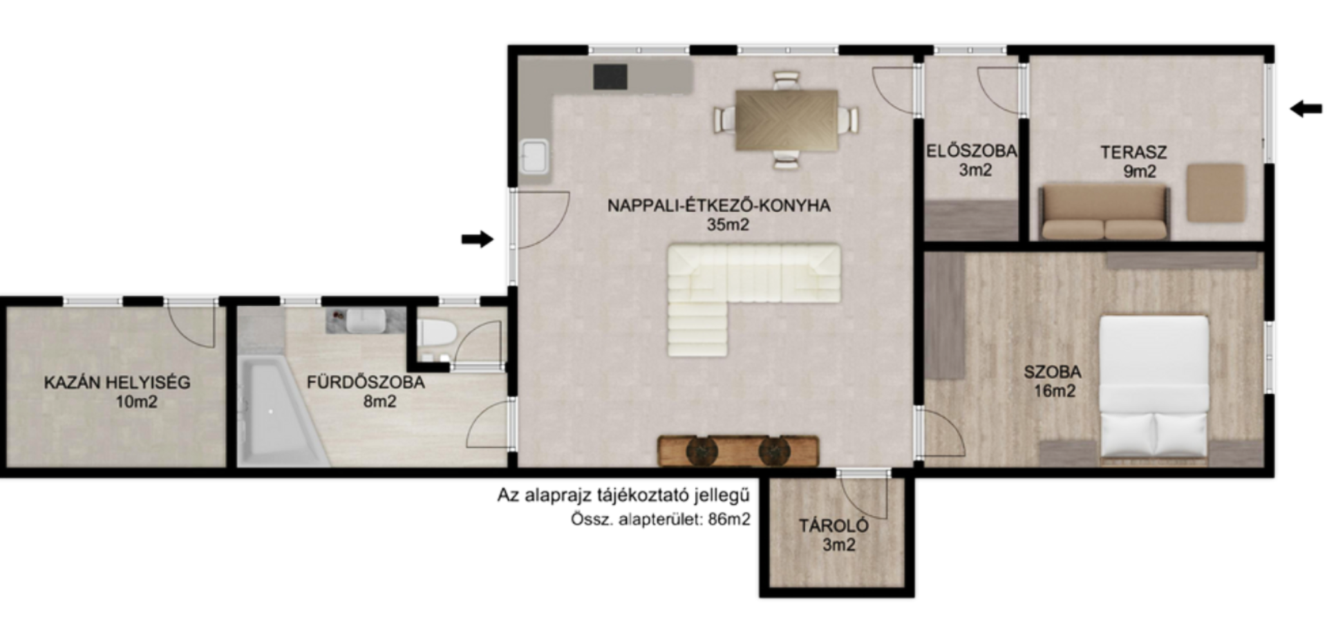 -Nappali konyha étkező egyben, fürdőszoba-wc külön, szoba, előszoba, kis tároló, udvarról nyíló kazánház.