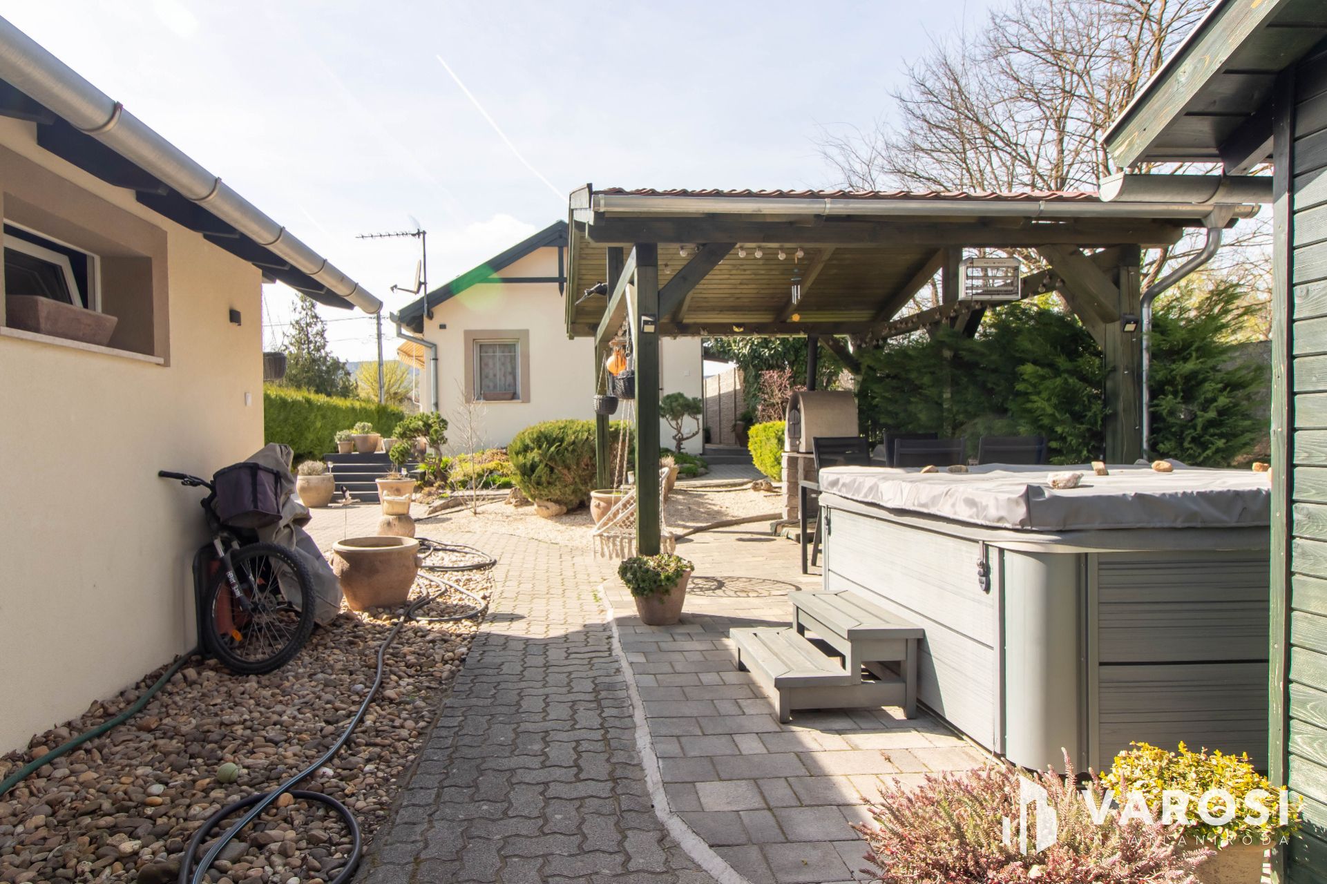Gondoltak az elektromos autóra is: a töltési lehetőség adott, a bejárat térkövezett, és egy tágas garázs is helyet kapott. A zárt, körbekerített kert valódi édenkert, ahol jakuzzi, veteményes, fiatal gyümölcsfák, fedett terasz és egy hangulatos kemence gondoskodik a tökéletes pihenésről és a baráti összejövetelek élményéről.
