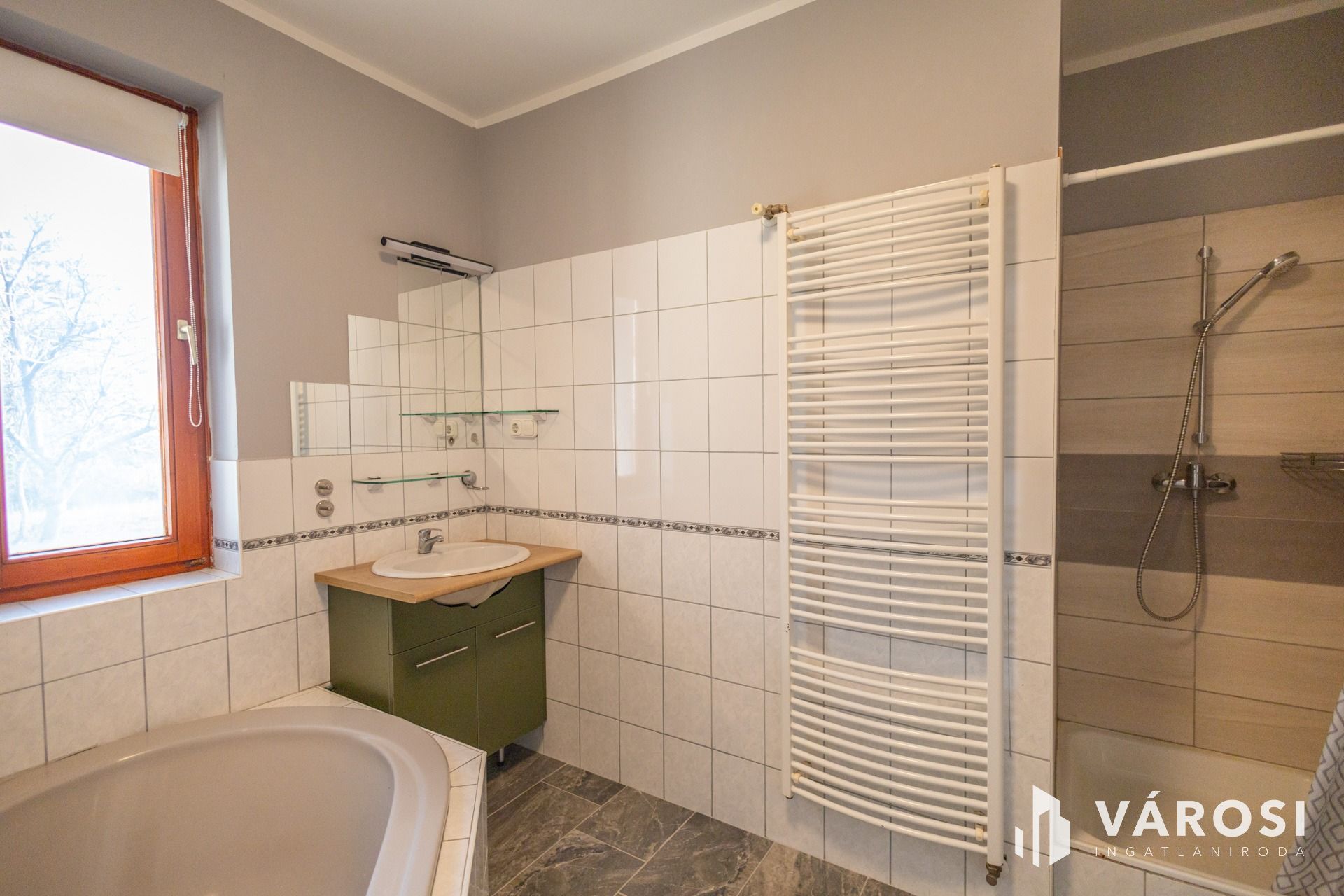 -Szobák és nappali laminált padlóval, egyéb helyiségek járólappal, mindenhol új padlóburkolat