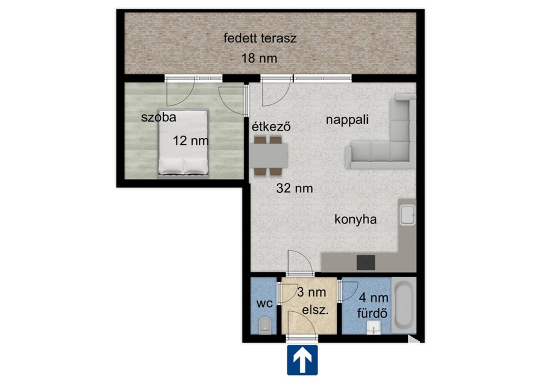 - Nappali, konyha-étkező, szoba, fürdő, WC, előtér, fedett terasz.