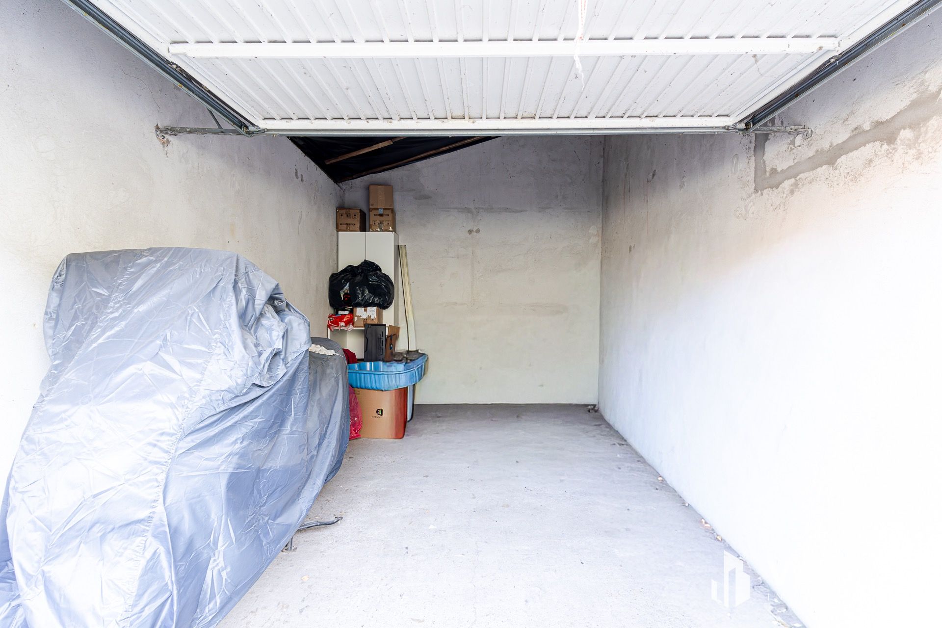Az ingatlan egy zárt belső udvarban található, amely elektromos kapuval közelíthető meg. A garázs billenő kapuval felszerelt, jó állapotú, beton aljzatú és festett falakkal rendelkezik.